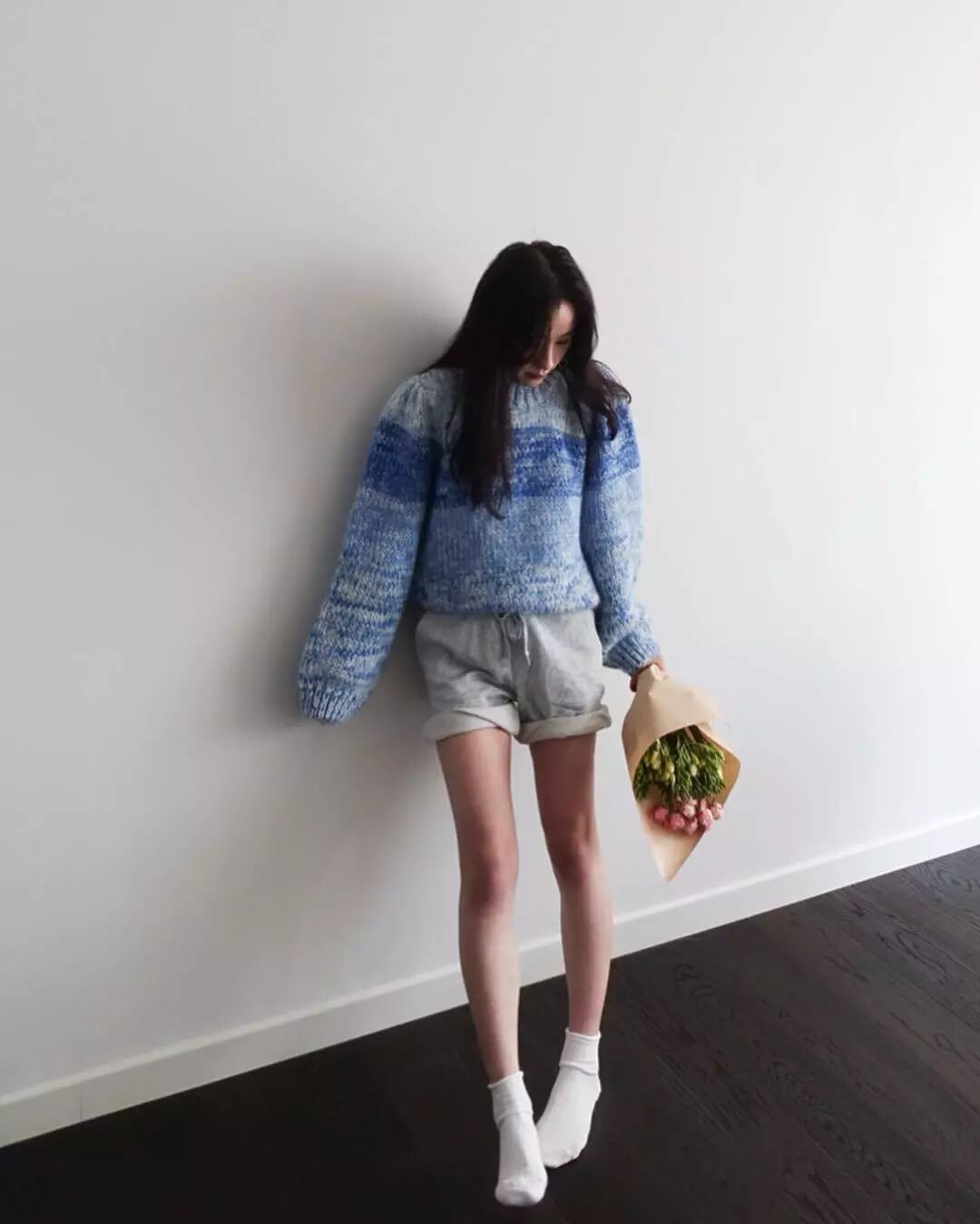 把雙手塞在寬大衛衣的袖子裡,上長下短的搭配更顯腿長。