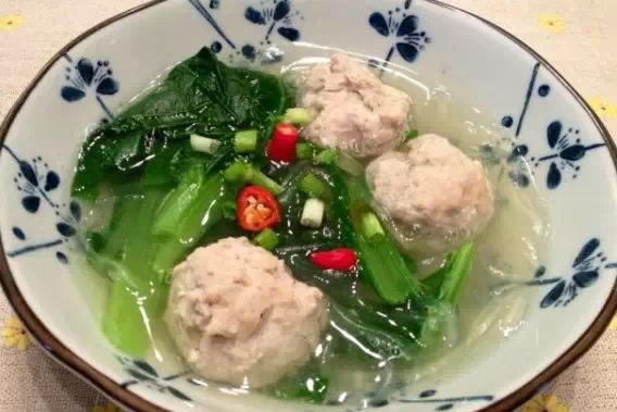 做法:雞胸肉剁碎,香菇切小塊,揉捏成肉丸,入少量水,汆半熟後,加入小白菜(任何快熟的時令蔬菜皆可),最後加雞精收幹。