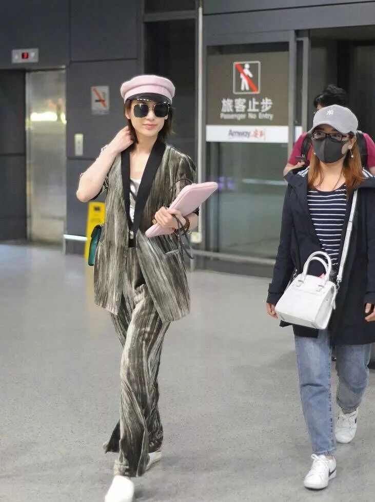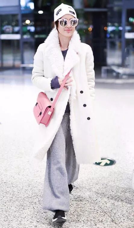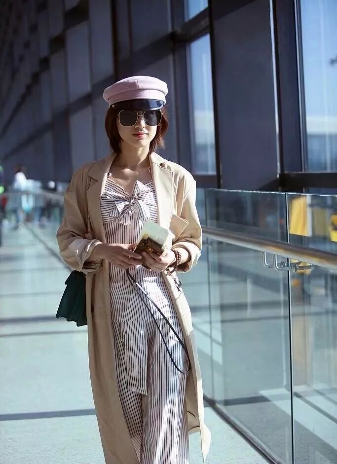 粉色的帽子好像很受黃聖依的喜歡,棕色的風衣看起來特別的有個性,內搭襯衫套裝,特別的時尚有架式這一身還是不錯的。