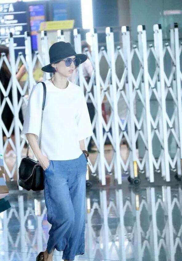 黑色的帽子使得臉看起來特別的小,白色的短袖搭配闊腳褲很有張力的打扮,這一身看起來是非常的舒服的搭配了。