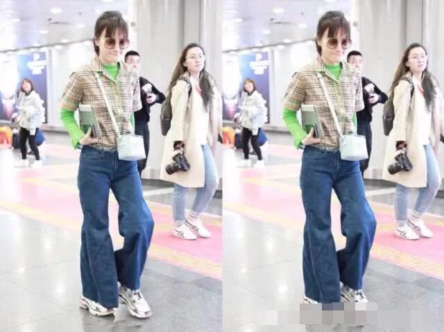 即使臀大腿粗,也絕不會放過這樣的緊身闊腿褲是嗎?何必這樣為難自己呢,關鍵是這綠色內搭和格紋襯衫搭配是幾個意思?太low了吧。