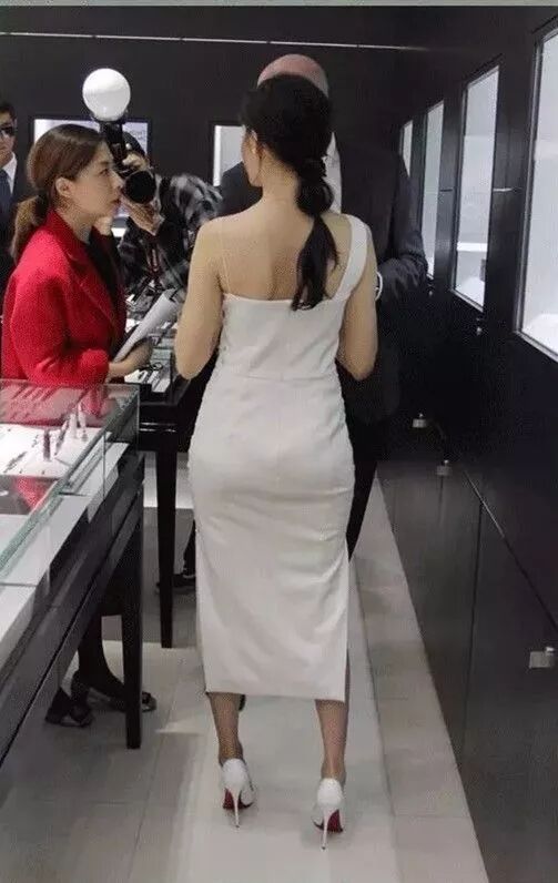 從背後看,她穿的這條白色緊身裙,把她的臀部大的缺點都凸現出來了,這樣的曲線真心沒有美感呢。