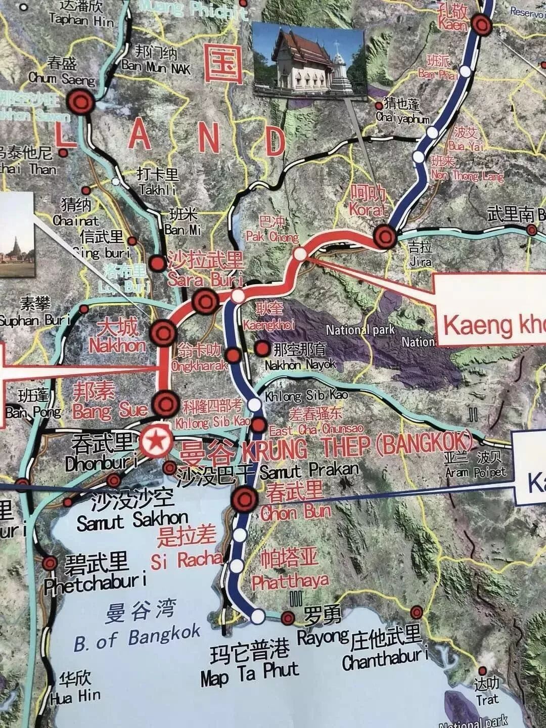 中泰鐵路是泰國東北部南北向快速鐵路幹線,北起泰國邊境城市廊開,南至首都曼谷及瑪它普港,全長845.27公里。一期工程曼谷至呵叻段已開工建設,全長252.3公里,設計時速250公里。中泰鐵路項目二期工程與中老鐵路的「磨丁至萬象」段做到連接,與中國鐵路系統接駁。