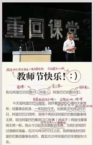 9月10日教師節,馬雲宣布退休計劃,震動輿論,他以自己的退位,贏得阿里的前進,身體力行地踐行了他那句話「阿里從來不屬於馬雲,但馬雲會永遠屬於阿里」。