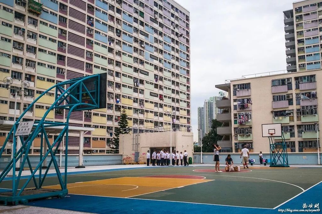 小貼士:彩虹邨的最佳拍攝地點就是停車場頂樓的籃球場,藍橙拼色的籃球場顯得格外耀眼。