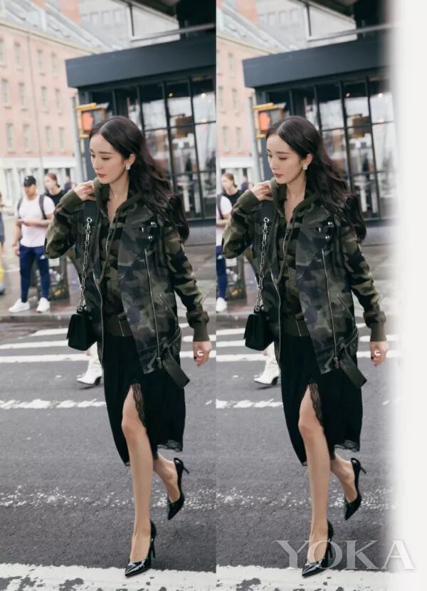 迷彩上裝搭配蕾絲開叉裙,她的美腿若隱若現,這也是我們能從她身上學到的穿衣之道。