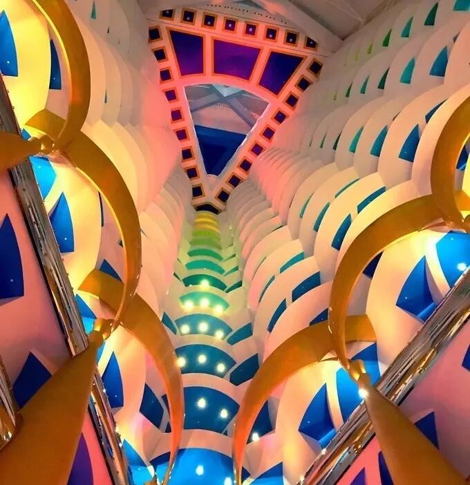 散步過後,可以選擇到帆船酒店用餐。帆船酒店的內部也一樣是滿滿的設計感,拿著相機抬頭一拍,又是一副像畫一樣的照片。