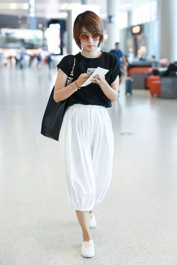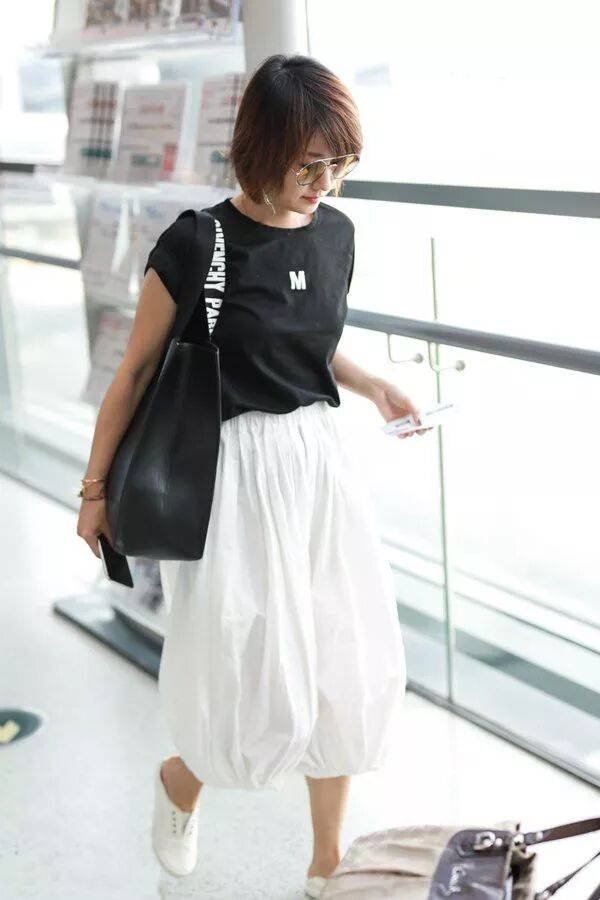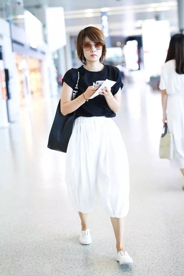 黑色短袖,幹練極了,同時搭配的白色寬鬆燈籠褲,簡直讓自己身高受限制,150的腿,馬伊琍你是認真的?