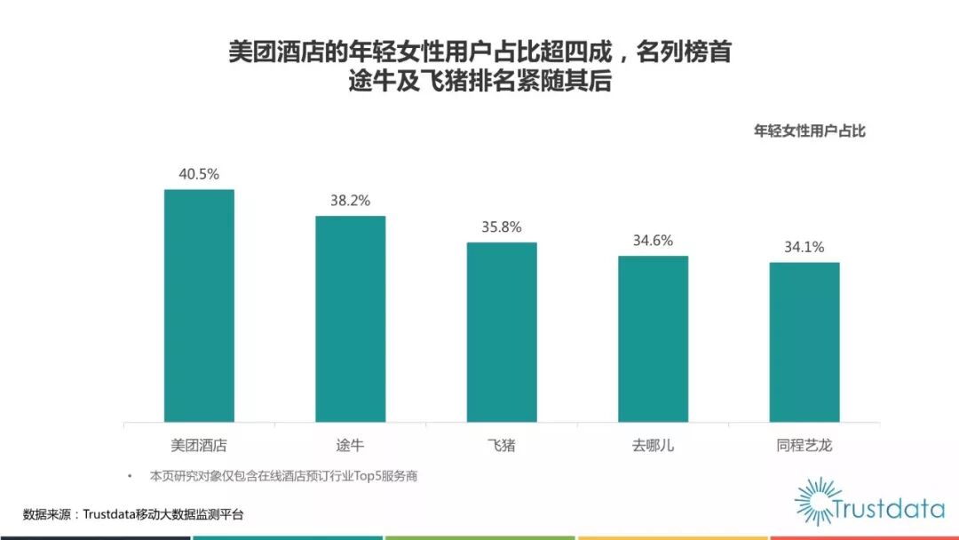 美團通過外賣、到店以及摩拜單車等獲得的用戶在年齡層次和性別方面與美團酒店也相匹配。Trustdata發布的《2018年Q2中國在線酒店預訂行業發展分析報告》顯示,美團酒店的用戶群體在目前幾大在線旅遊平台中最為年輕,集中在20歲到30歲之間,並且女性用戶數在幾家中也是最多的。