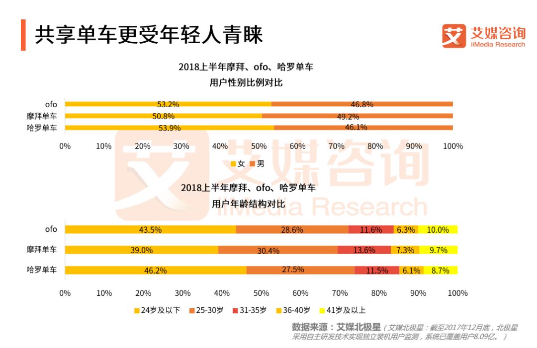 而美團80%的用戶年齡在30歲以下,摩拜單車的用戶年齡在30歲以下的占比將近70%,並且女性用戶居多,占比超過50%。